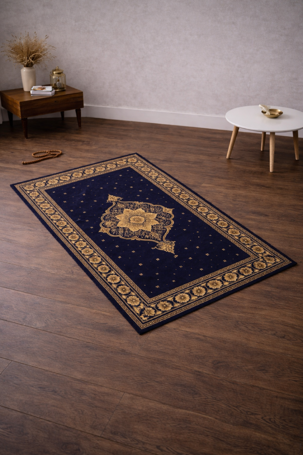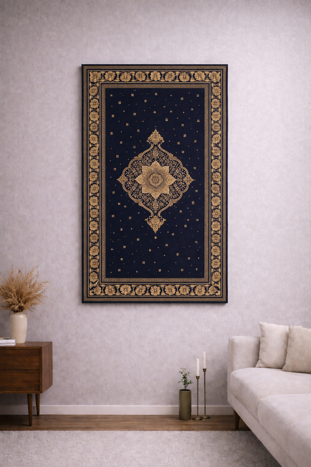 This piece reimagines the prayer mat as something proudly visible rather than tucked away. Thoughtfully designed for dual functionality with discreet internal magnets, it hangs securely and elegantly when not in use, transforming from a functional prayer mat into a statement art piece within the home.